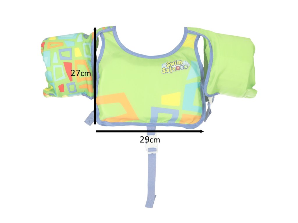 Pěnové polstrování vesty zaručuje vynikající vztlak a díky přiloženým rukávům lemovaným měkkým materiálem se dítě může ve vodě snadno udržet na hladině. Nastavitelné zapínání na přezku zajišťuje dokonalé přilnutí k tělu malého dítěte a poskytuje mu pohodlí během hry. Vesta se vyznačuje výraznouzelenou barvou a zajímavým vzorem, které přitahují pozornost a zviditelňují dítě i z dálky.