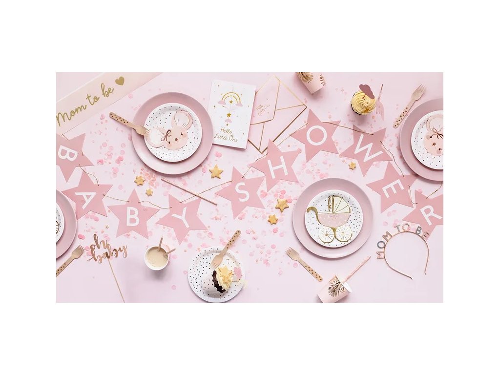 Banner ve tvaru hvězdy s nápisem Baby Shower ze světle růžového papíru. Dvě možnosti zavěšení nápisu. Rozměry: 90 cm x 16,5 cm.