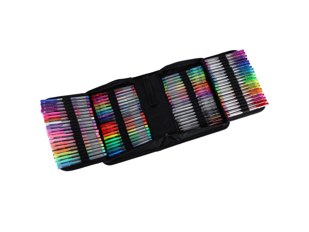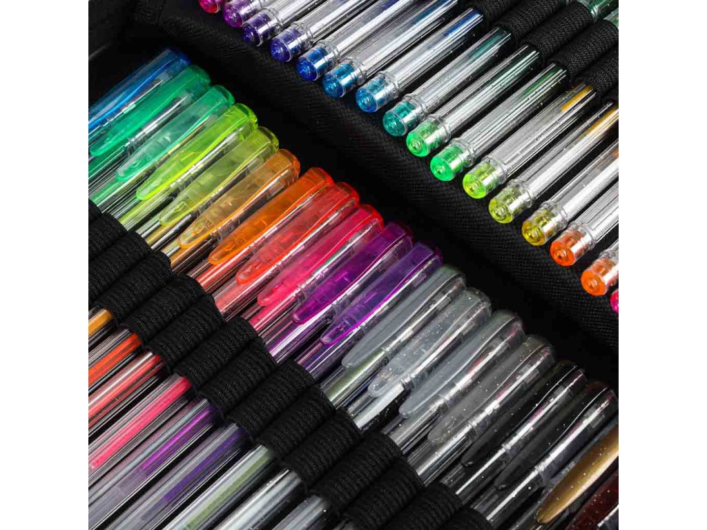 Sada 100 gelových per v rozkládacím pouzdře.