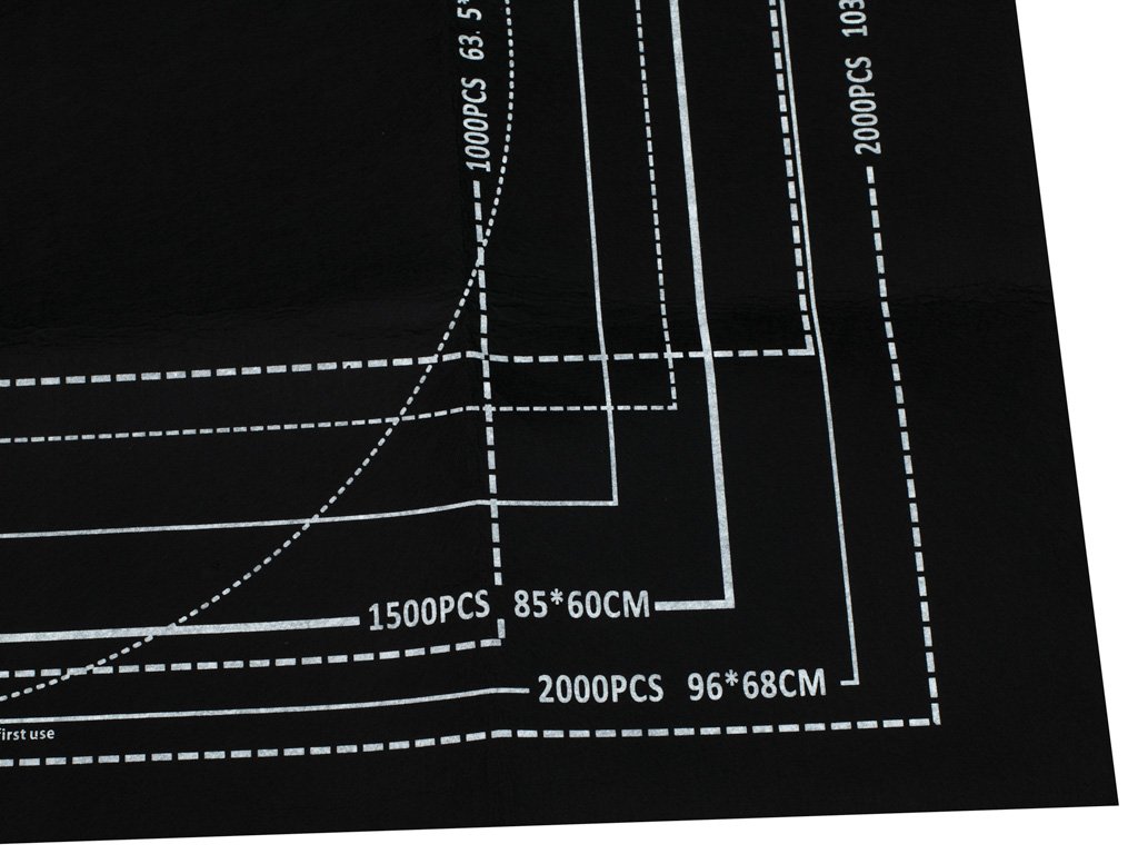 Podložka je vyrobena výhradně z polyesteru se strukturou připomínající plsť. Má bílý rámeček, který ukazuje, jak velkou plochu bude uspořádaný vzor zabírat.