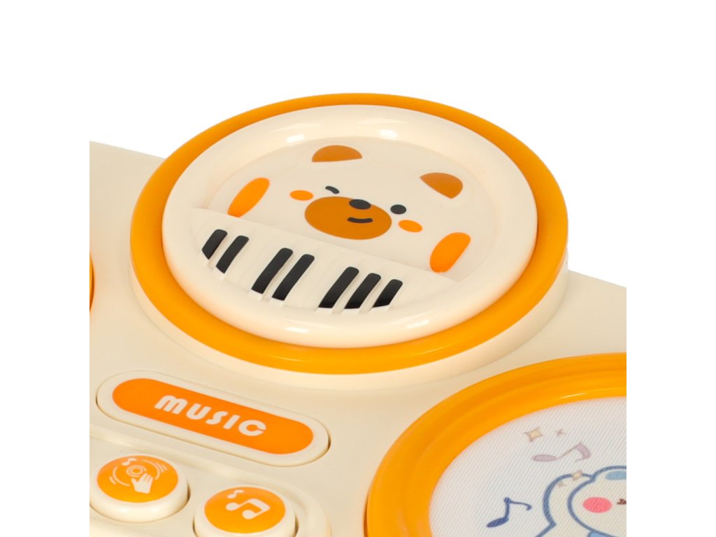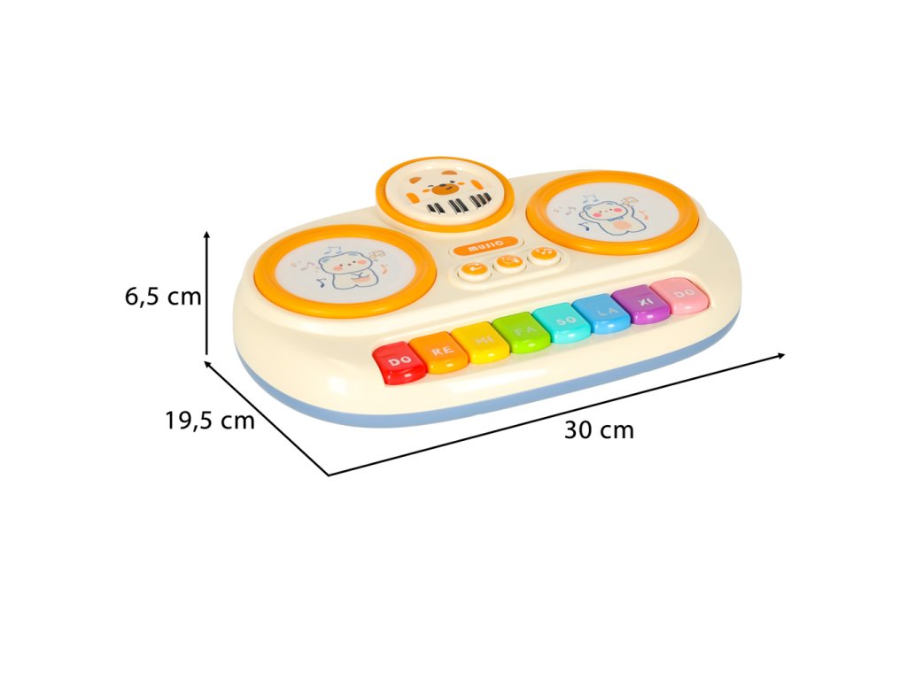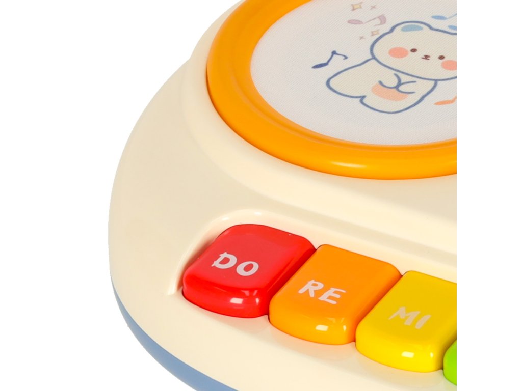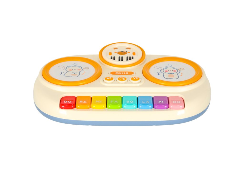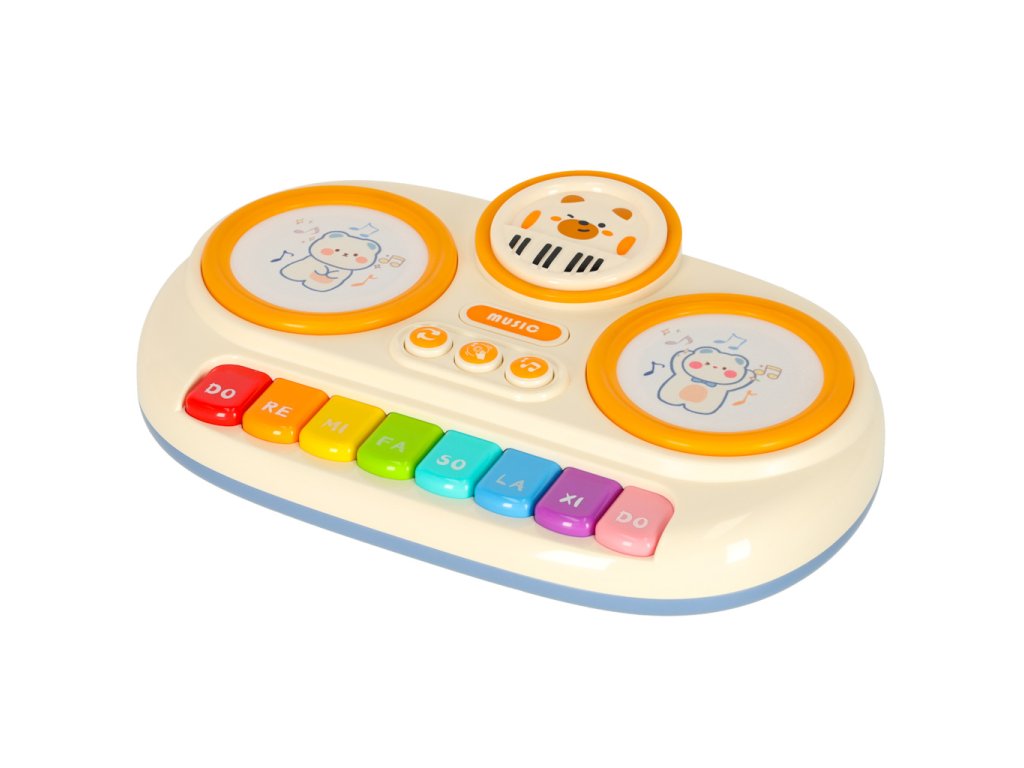 Tato vzdělávací hračkapiano obsahuje různé režimy hraní - od klasických zvuků až po rytmičtější sekvence obohacené světly. Ideální pro učení barev, rytmu a rozvoj hudebního sluchu. Kromě toho stojí za zmínku izajímavá funkce - kulaté dílky s měkkou povrchovou úpravou, které fungují jako mini bubínky. Stačí, aby do nich batole udeřilo rukou, a hračka začne hrát rytmické zvuky bubínků s melodií, čímž dítě získá pocit samostatnosti a radosti z aktivní hry.