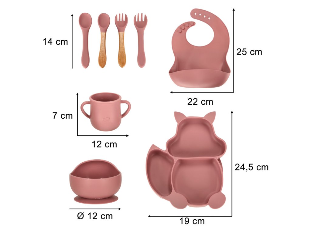 Všechny prvky jsou dokonale přizpůsobeny malým ručičkám a mají hladké hrany, takže je sada ideální pro výuku samostatného stolování.