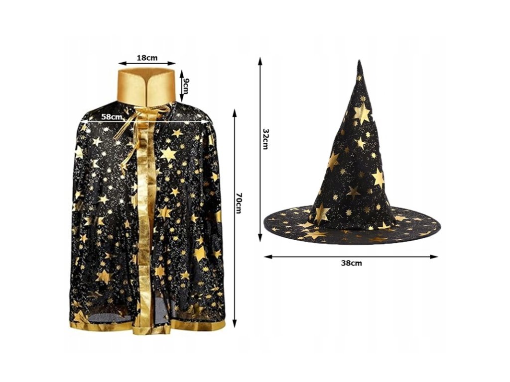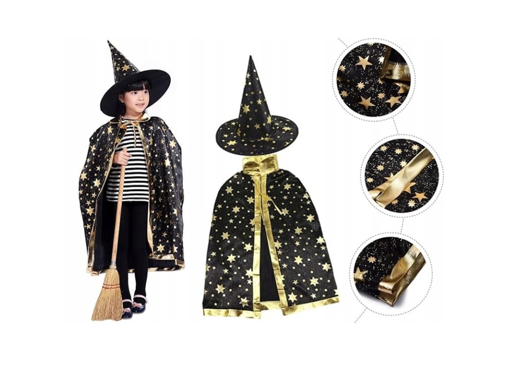 Dětský čarodějský kostým – pláštěnka a klobouk z lehkého polyesteru. Univerzální velikost, ideální pro Halloween, karneval i kouzelné hry. Rychlý a pohodlný převlek pro malé čaroděje.