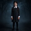 Wednesday Addams kostým pro děti (135 cm) – černé šaty s bílým límečkem, pružný polyester. Stylový převlek na Halloween, karneval i cosplay. Pohodlný a připravený pro malé hvězdy temnoty.