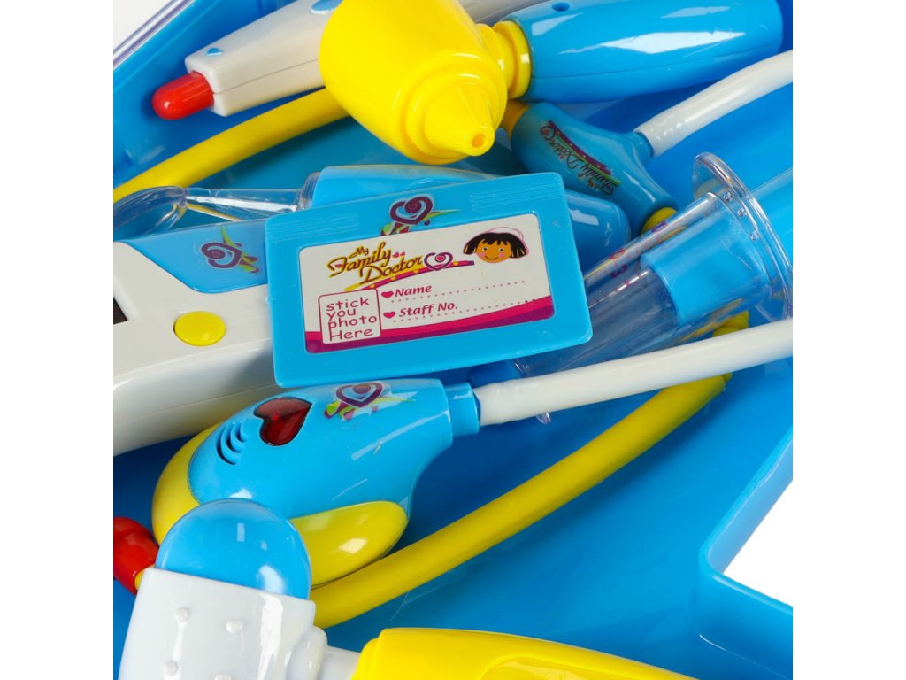 Vzdělávací hračka, sada malých lékařů pro děti. Zvukové a světelné efekty. Sada obsahuje: kladívko, stetoskop, teploměr, injekční stříkačku, náplast, lékařské zrcátko, otoskop. Napájení: 2 baterie AG13, 8 baterií AG10 (součástí dodávky).