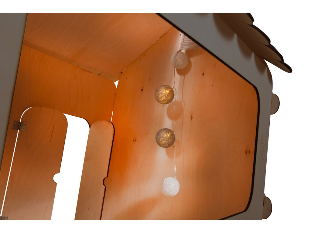 Dřevěný dětský domeček se stolem. Má tabuli, na kterou mohou děti kreslit. Domeček bude herním centrem dětského pokoje. Rozměry: 86 x 137 x 105 cm.
