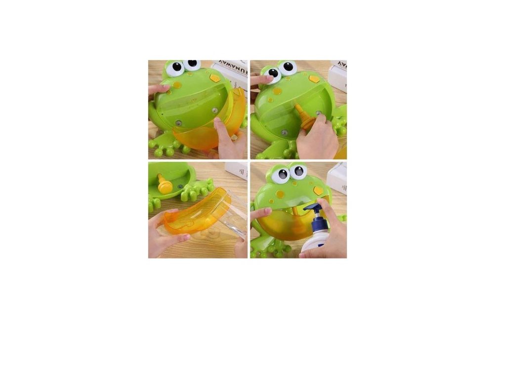 Nejprve odšroubujte zadní krytku na žábě, a vložte baterie. Žábu nalepte pomocí přísavek na hladký rovný povrch – nejlépe dlaždice. Žabí tlamu vyjměte a naplňte vodou smíchanou s mýdlem nebo pěnou do koupele. Čím více mýdla namícháte, tím více bude bublinek. Vložte do otvoru žlutou trysku a tlamičku nasaďte zpátky. Nyní stačí zapnout tlačítko a zábava může začít. S veselou žábou bude případný strach z vody překonán.