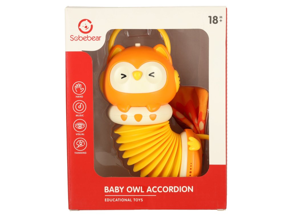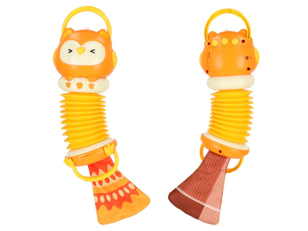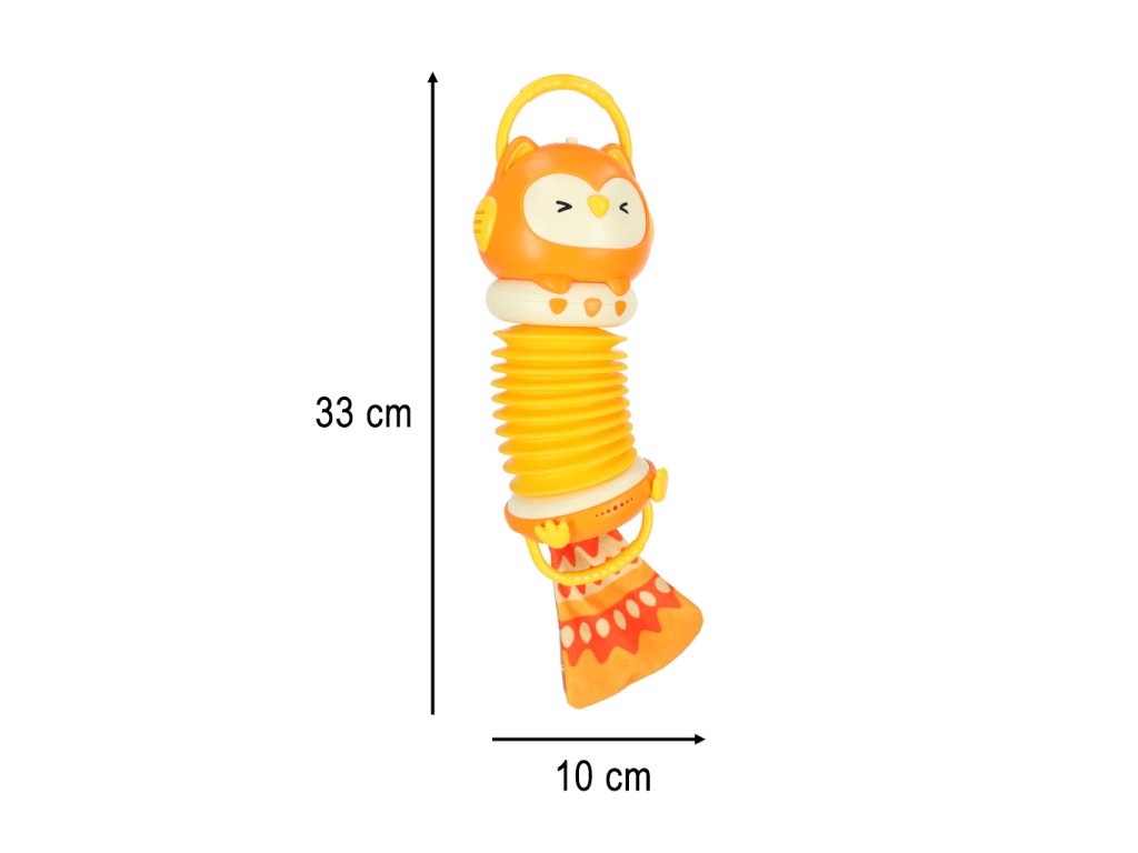 AKORDEON HARMONIE PRO DĚTI ORANŽOVÁ SOVA HRAJÍCÍ POD VEDENÍM 30CM Harmonie pro děti: Skvělá jako první hudební hračka! Poskytne spoustu zábavy a rozvíjí řadu užitečných dovedností! Má světla a reproduktor, hodný malého umělce! Je vybavena šustícím ocáskem! Technické specifikace: - je vybaven šustícím chrastítkem: Věk: 18m+ Materiál: plast Napájení: 2 x baterie AA (nejsou součástí balení) Rozměry: Sova akordeon: Rozměry: 33 cm x 10 cm Obal: 19 cm x 24 cm x 10,5 cm Hudba je skvělý způsob, jak stimulovat rozvoj dítěte, a to jak manuální, tak intelektuální! Zajímavý design a šustící ocásek podpoří hru, která zlepší přesnost rukou batolete a rozvíjí jeho sluch a přesnost! Harmony je napájena dvěma bateriemi AA! Když se vybijí, jednoduše je vyměňte a zábava může pokračovat! Výrobek je zabalen v estetické kartonové krabici s okénkem, takže je ideální jako dárek!