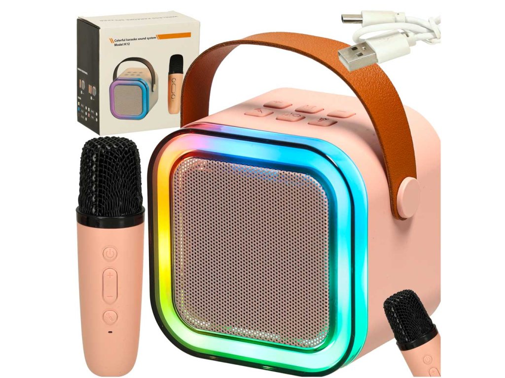 KARAOKE SET MIKROFON + PŘENOSNÝ REPRODUKTOR BLUETOOTH USB LED RŮŽOVÁ