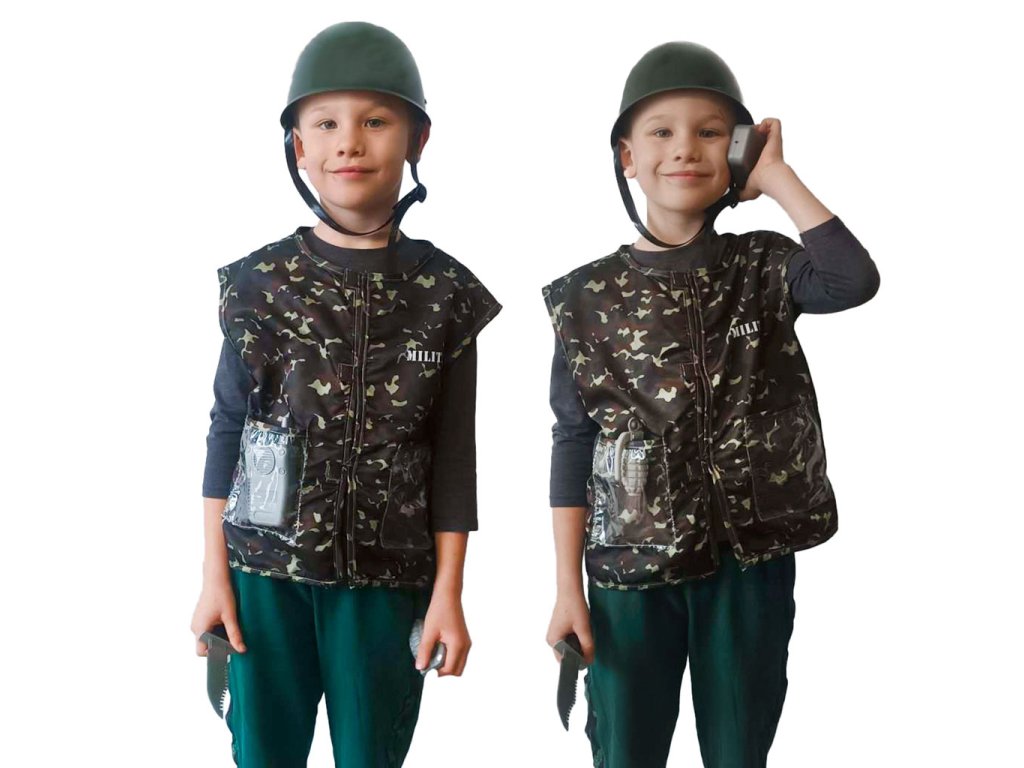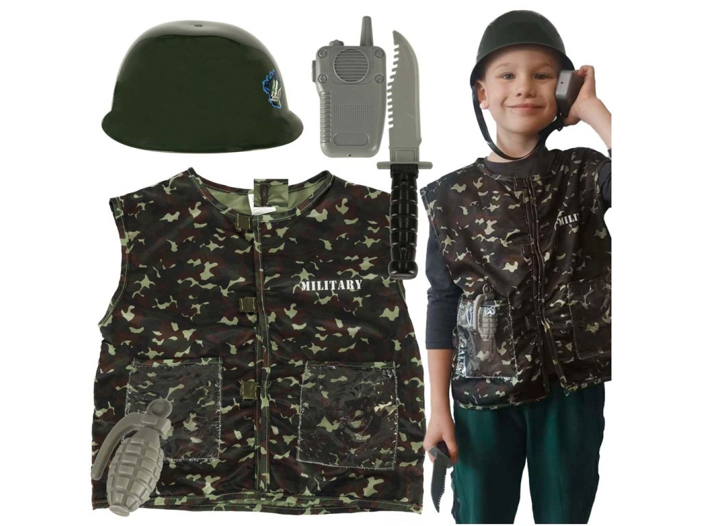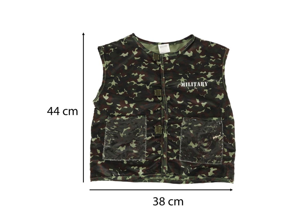 Součástí sady je vesta se vzorem moro a vojenská helma!