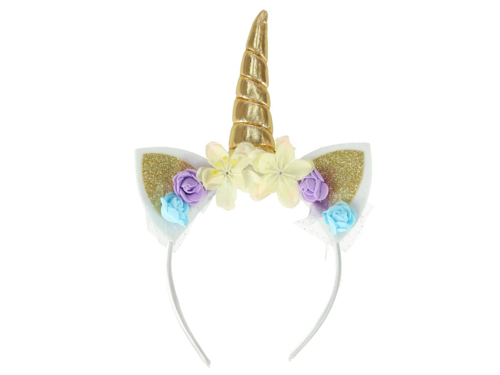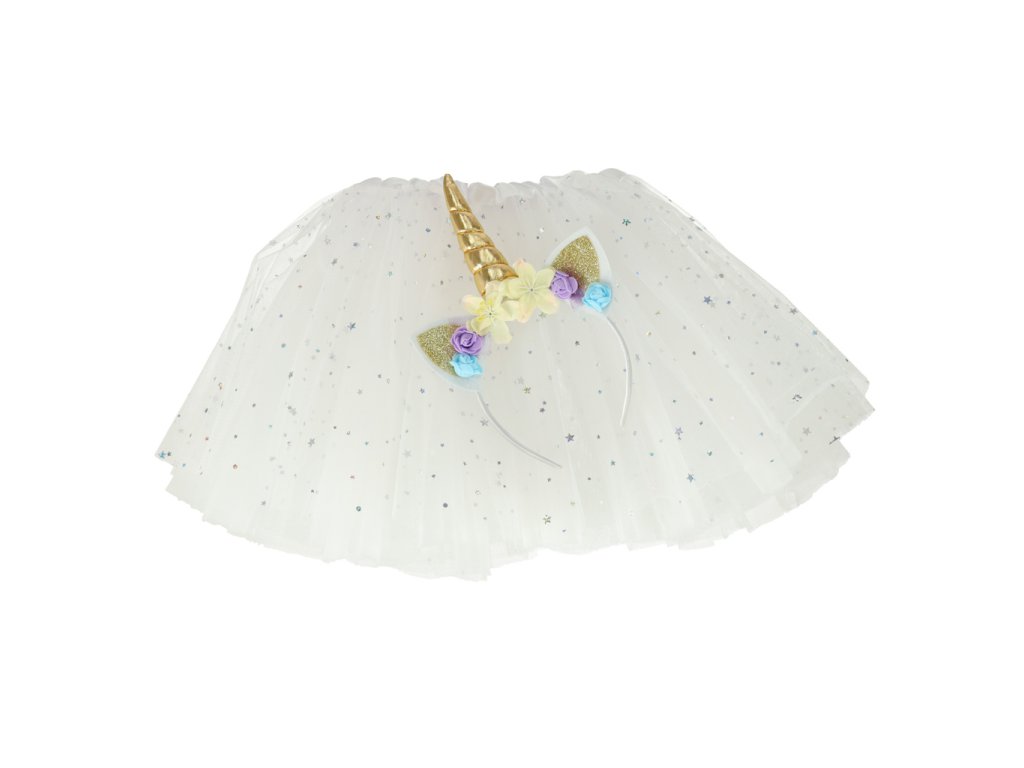 Karnevalovýkostým jednorožce s čelenkou a bílou princeznovskou sukní pokrytou třpytivými hvězdami.