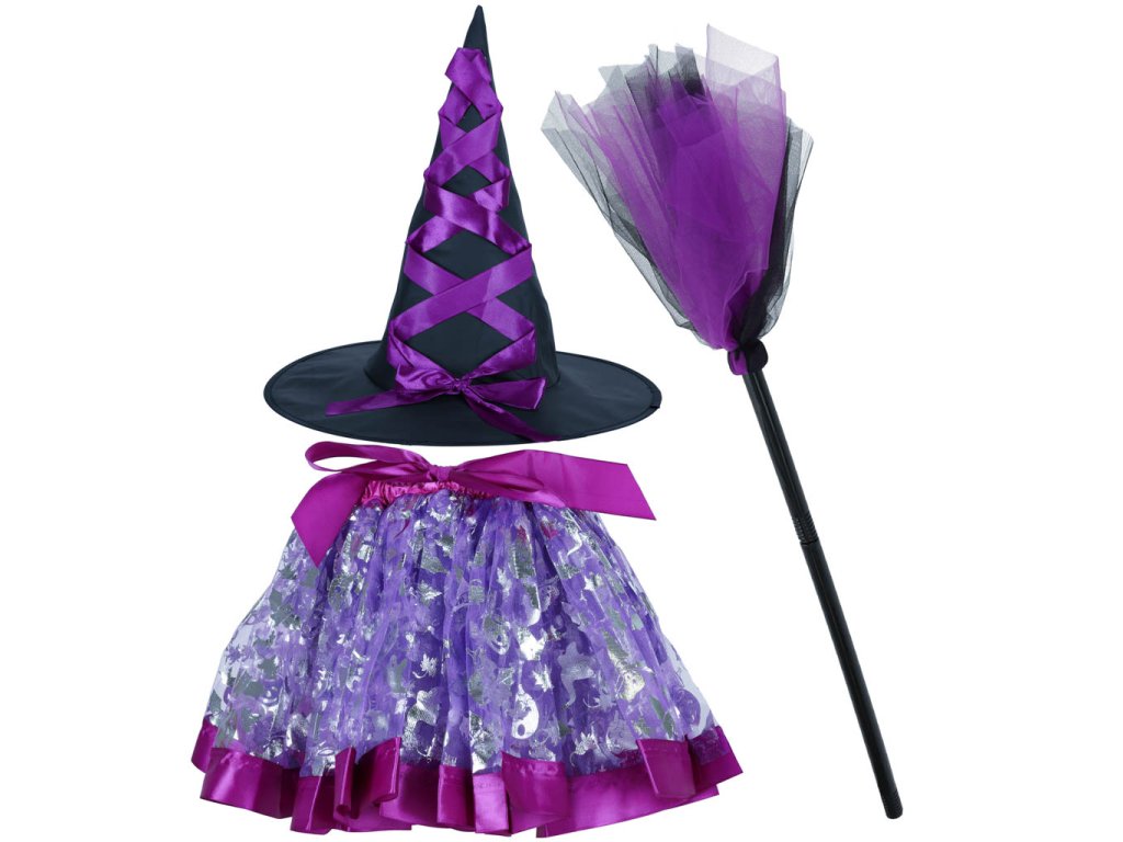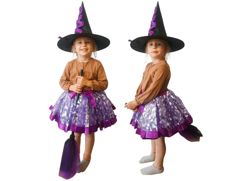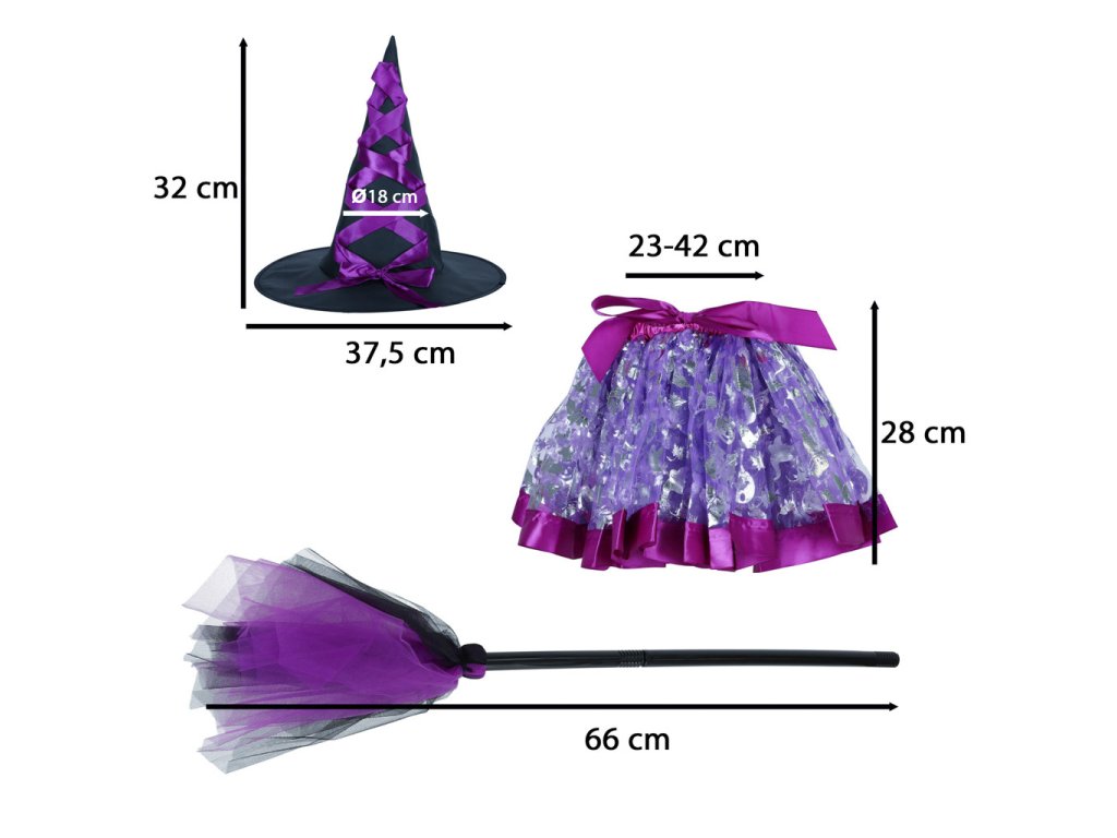 Kostým čarodějnice - ideální na maškarní ples, tematickou party nebo Halloween. Obsahuje tylovou sukni, klobouk a koště. Kostým s akcenty ve fialové barvě. Materiál: polyester, bavlna, plast. Šířka sukně: Šířka sukně: 23-42 cm.