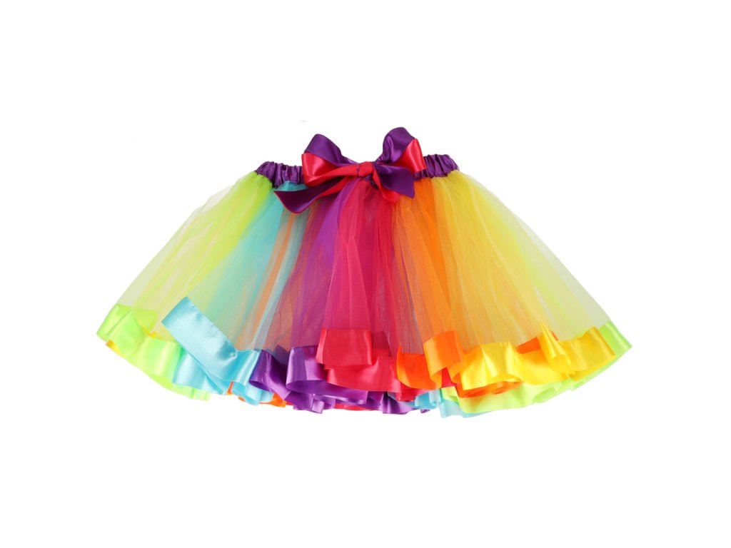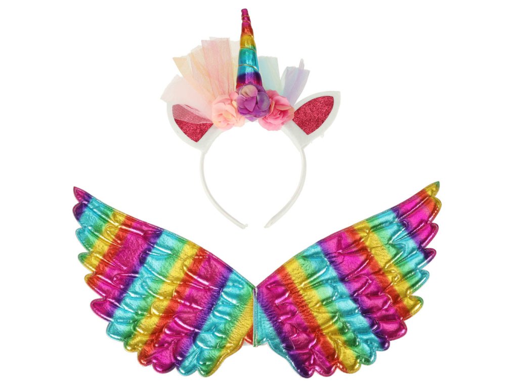 Kostým duhového jednorožce - ideální na maškarní ples nebo tematickou party. Obsahuje tylovou sukni, čelenku s rohem a barevná křídla. Materiál: polyester. Délka sukně: Délka sukně: 30 cm. Šířka gumičky: 2x 25-47 cm.