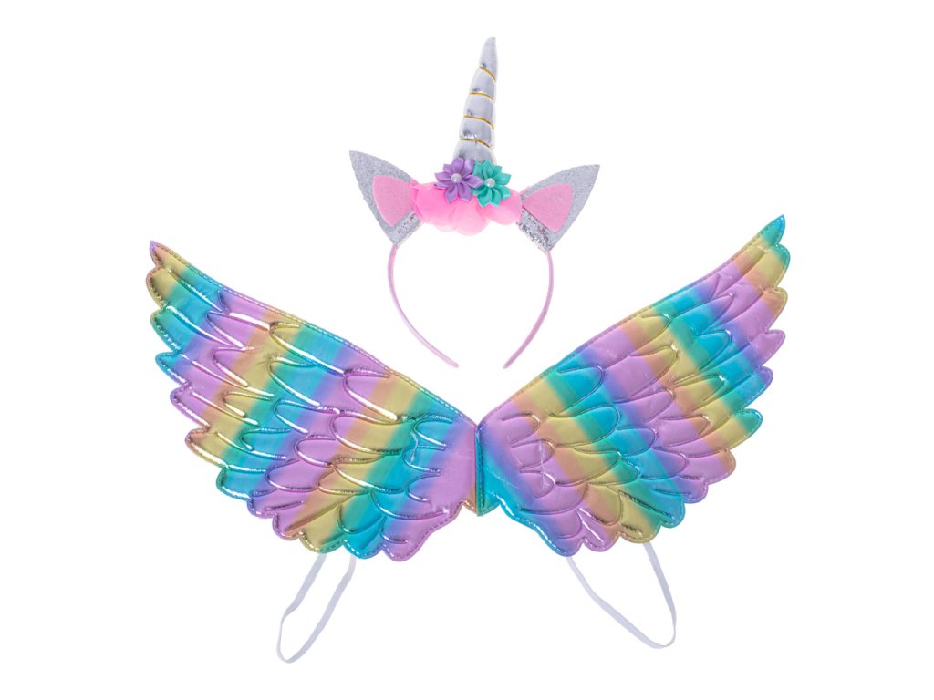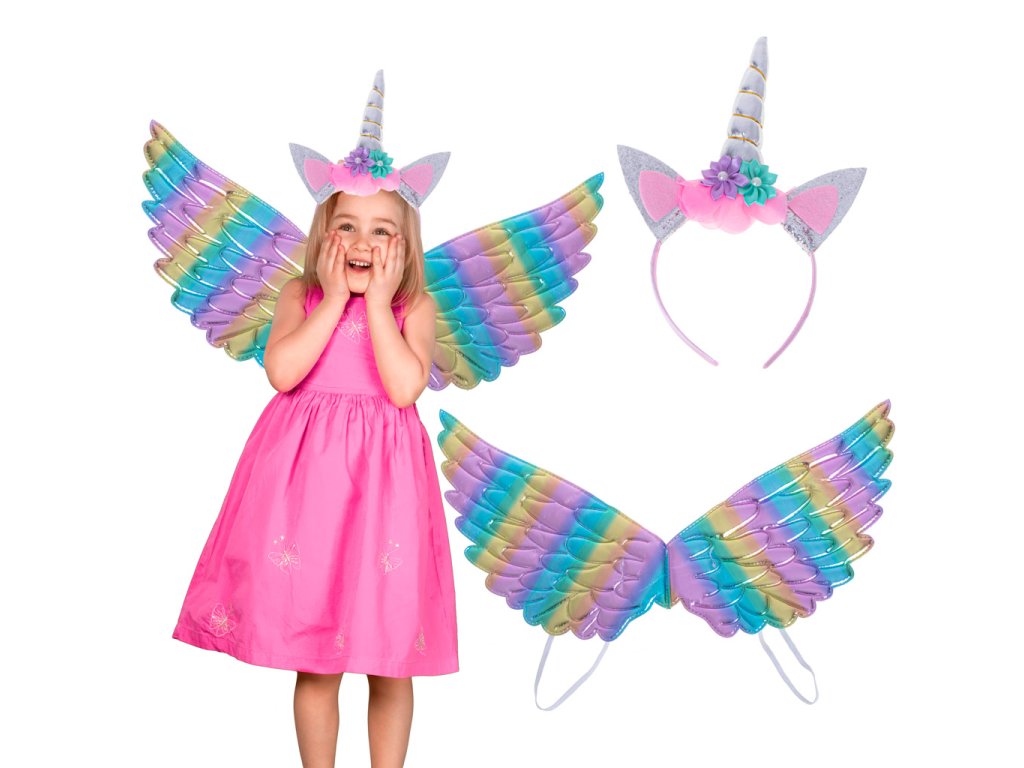 V sadě najdete čelenku s flitrovanými ušima a výrazným jedním rohem, ale také duhová křídla. Vaše dítě se bude moci převléknout za kouzelné zvíře, které všichni tak dobře znají - jednorožce!