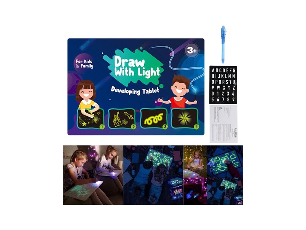 Zábavné malování pro holky i kluky. Rozvíjejte tvůrčí potenciál vašich dětí a pořiďte jim tuto kreslící tabulku. Toto malování se bude dětem líbit. Na tabulku dítě kreslí světelným perem. Jas tahu pera závisí na tom, jakou intenzitou je kresleno. Při kreslení obrázků může dítě zapojit vlastní fantazii a nebo použít šablonu. Nakreslené obrázky se nedají smazat, ale po chvíli začnou samy mizet.