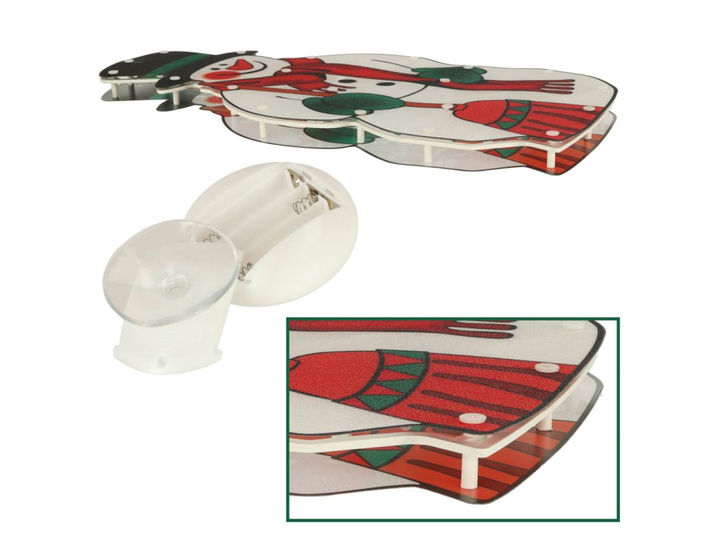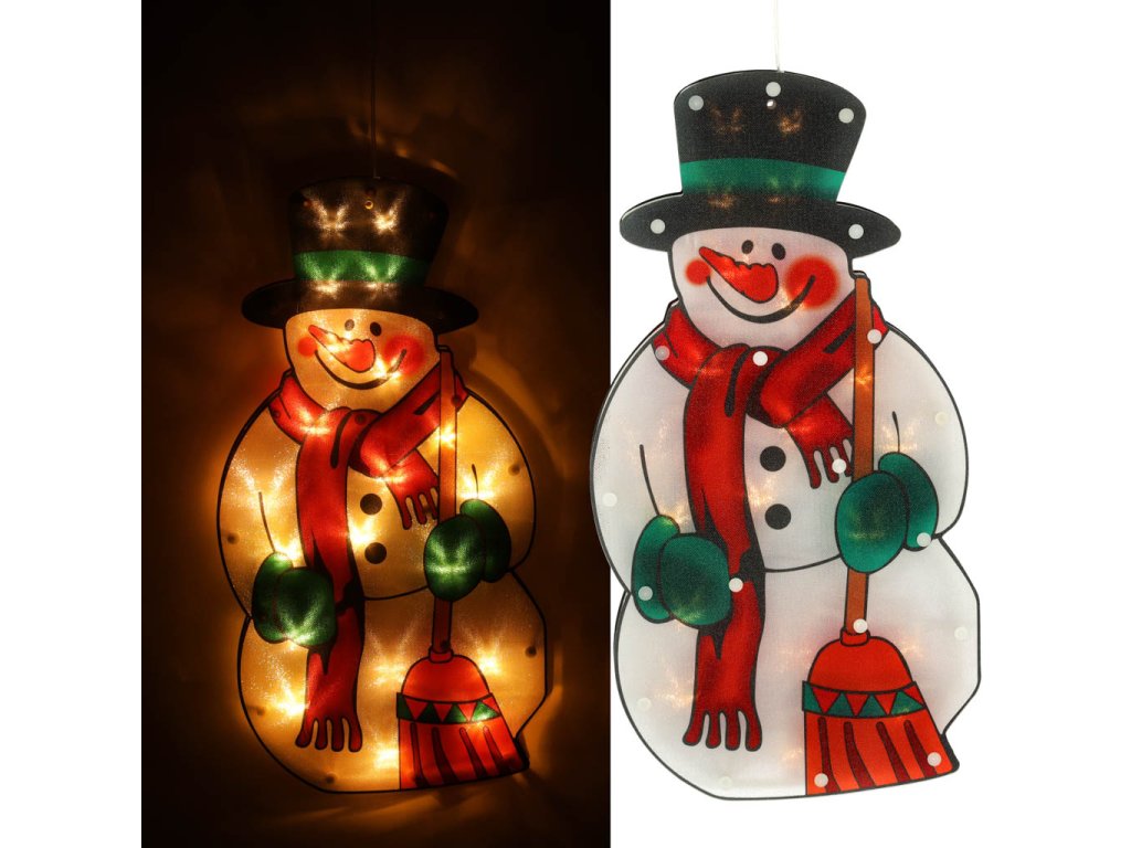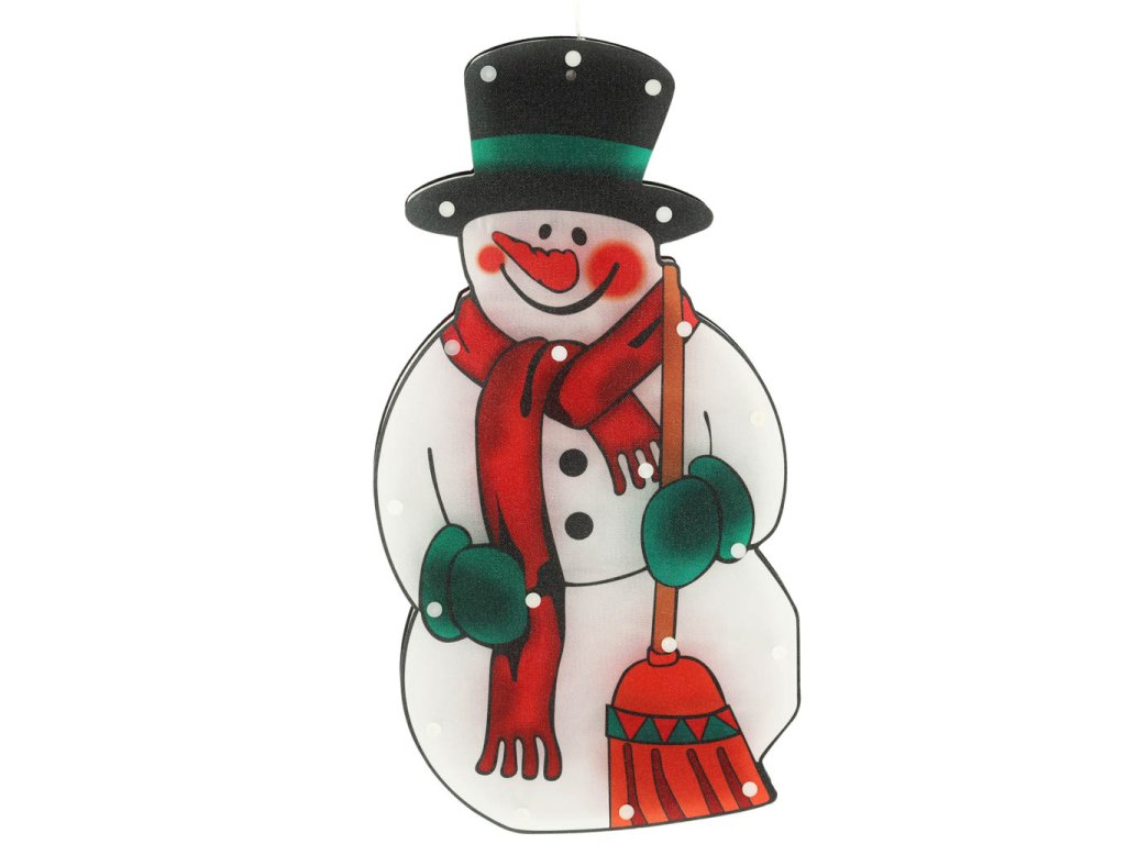 Fantastická vánoční dekorace ve tvaru sněhuláka s LED světýlky. Přinese kouzlo Vánoc. Bude se krásně vyjímat ve výloze. Napájení: 3 baterie AAA. Upevnění: pomocí přísavky. Celková délka: 75 cm. Rozměry sněhuláka: Rozměry: 22,6 cm x 45 cm.
