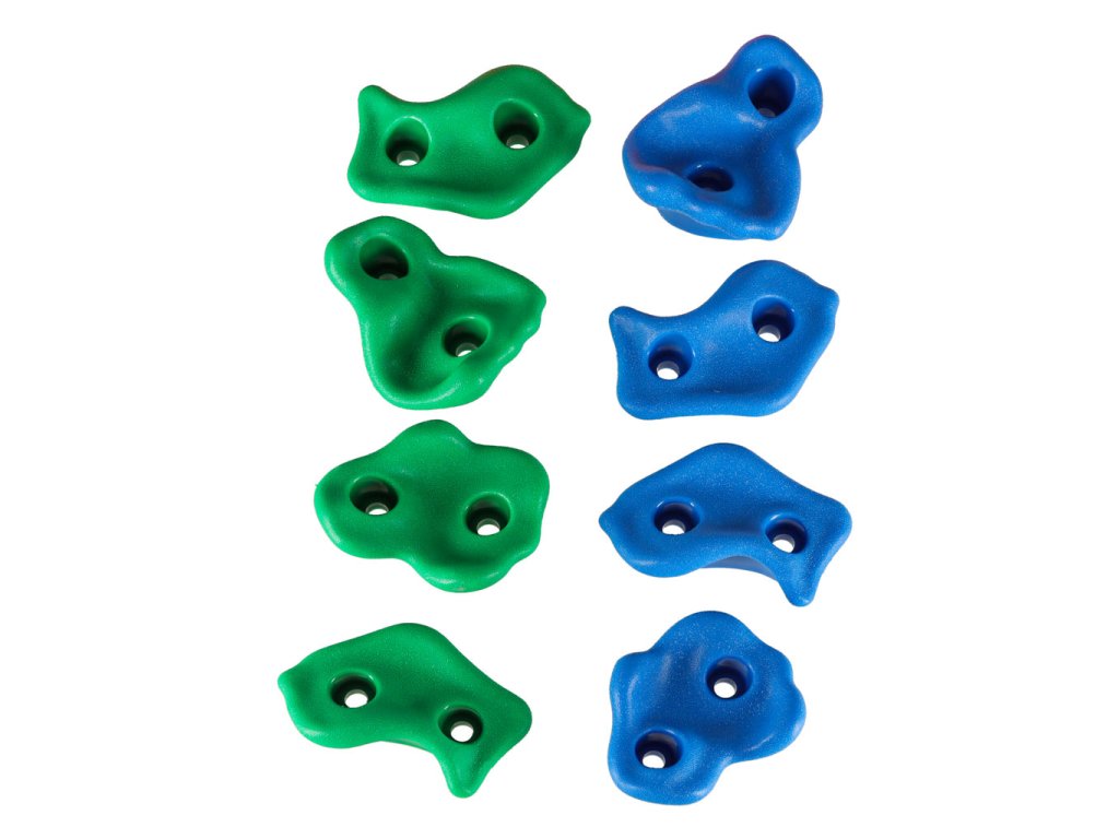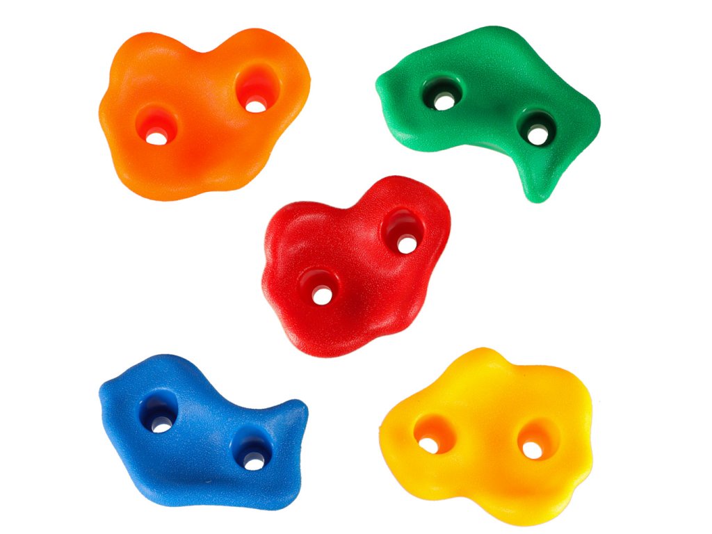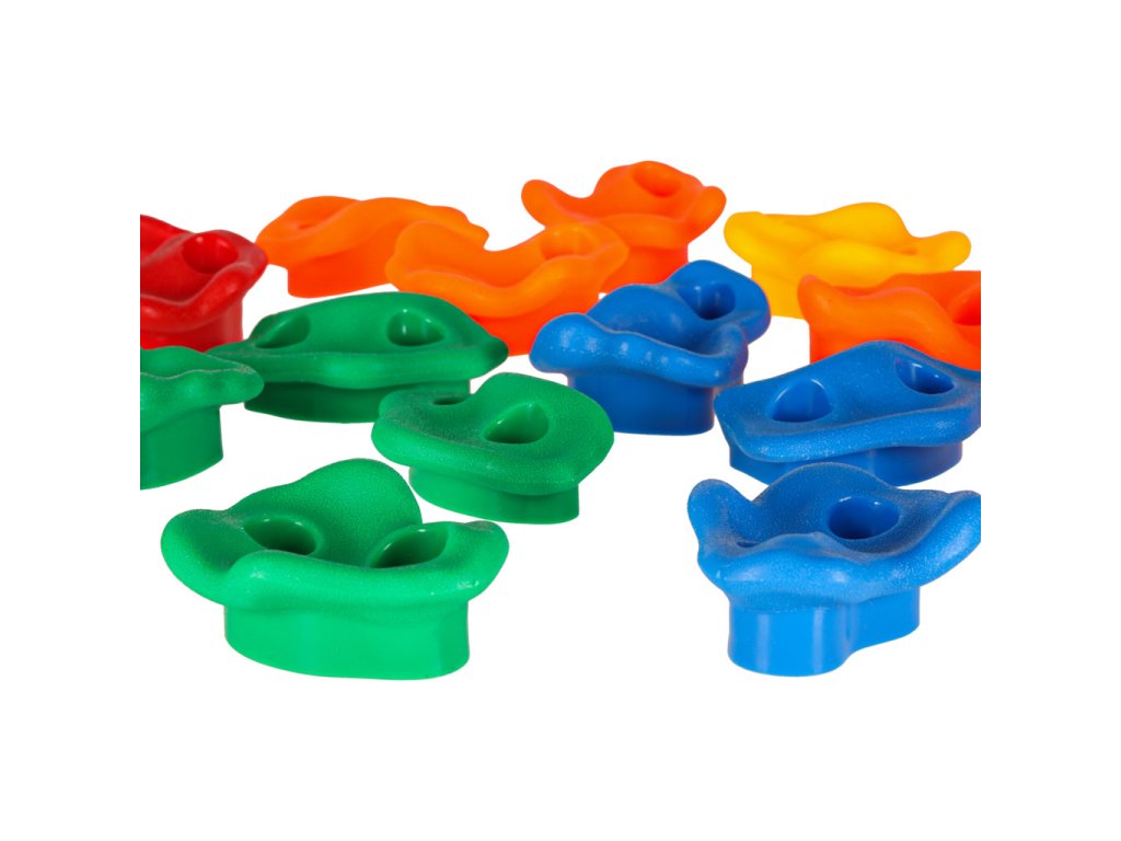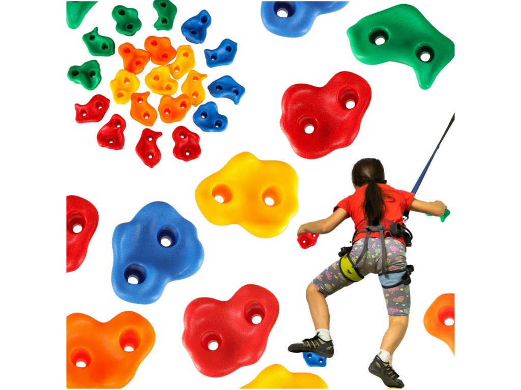 Sada obsahuje až 20 různých lezeckých kamenů, což jsou speciální dětské úchyty, které umožňují vytvořit lezeckou trasu podle úrovně dítěte. Tvary a barvy bylynavrženy s ohledem na ty nejmenší - každý chyt je dobře tvarovaný a bezpečný pro ruce i nohy.