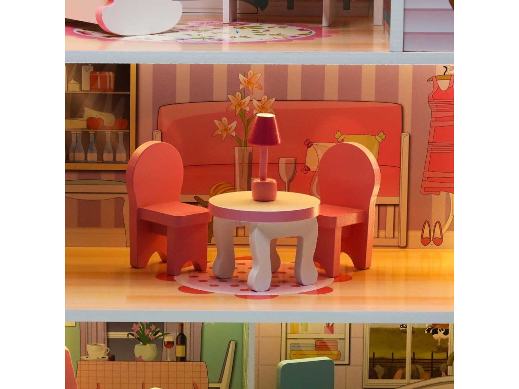 MDF dřevěný domeček pro panenky + nábytek 70cm růžový LED