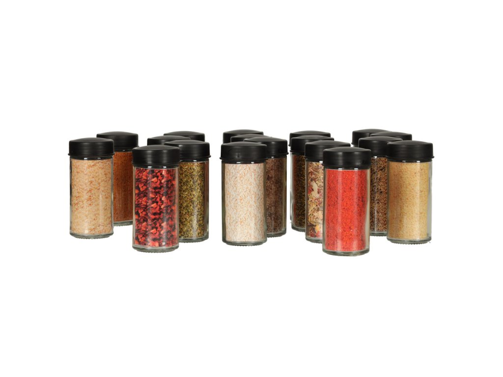 Obsahuje 18 šroubovacích skleněných nádobek.