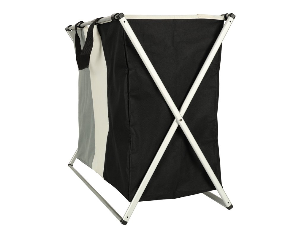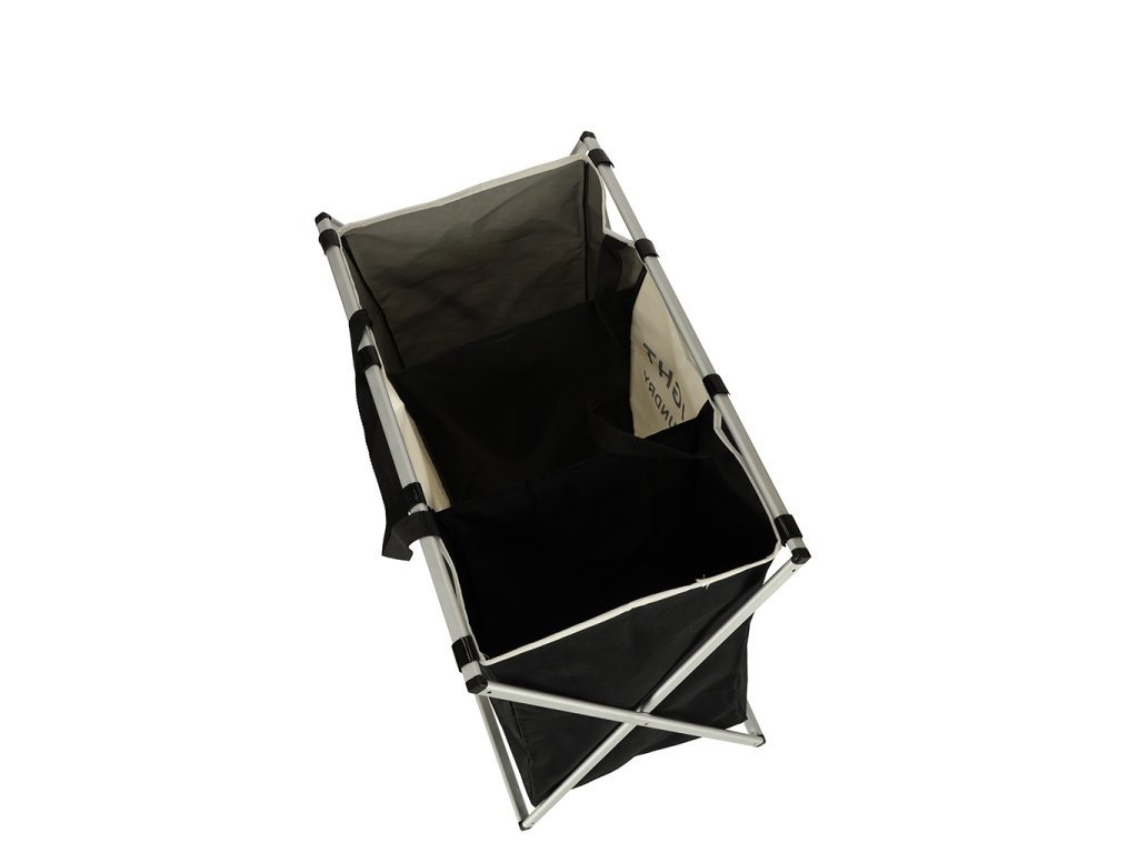 Skládací koš má robustní kovový rám a nádoby jsou vyrobeny z odolného materiálu. Oba kusy spojíte dohromady během chvilky pomocí pevných suchých zipů.