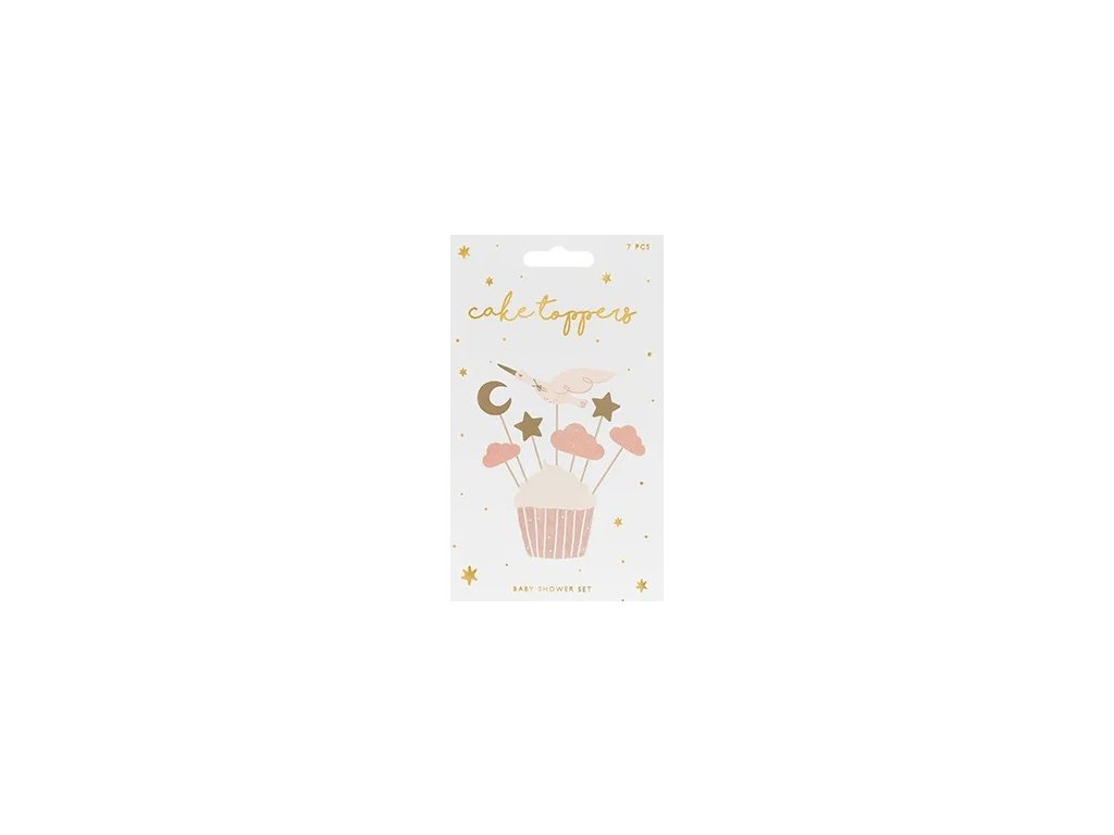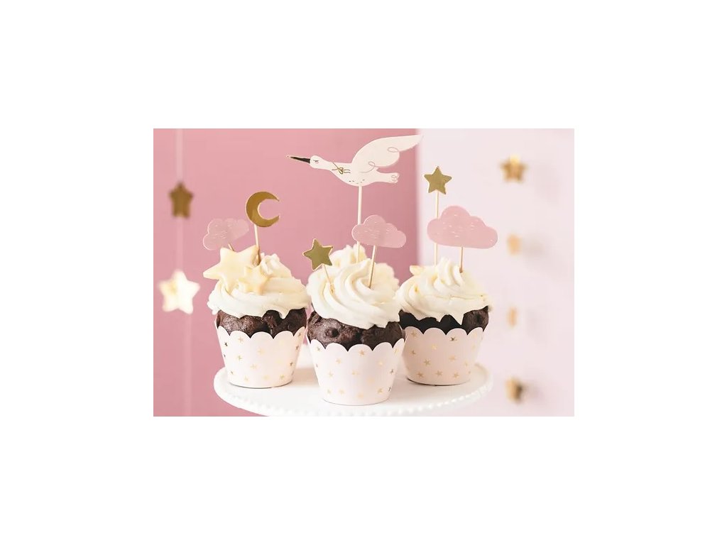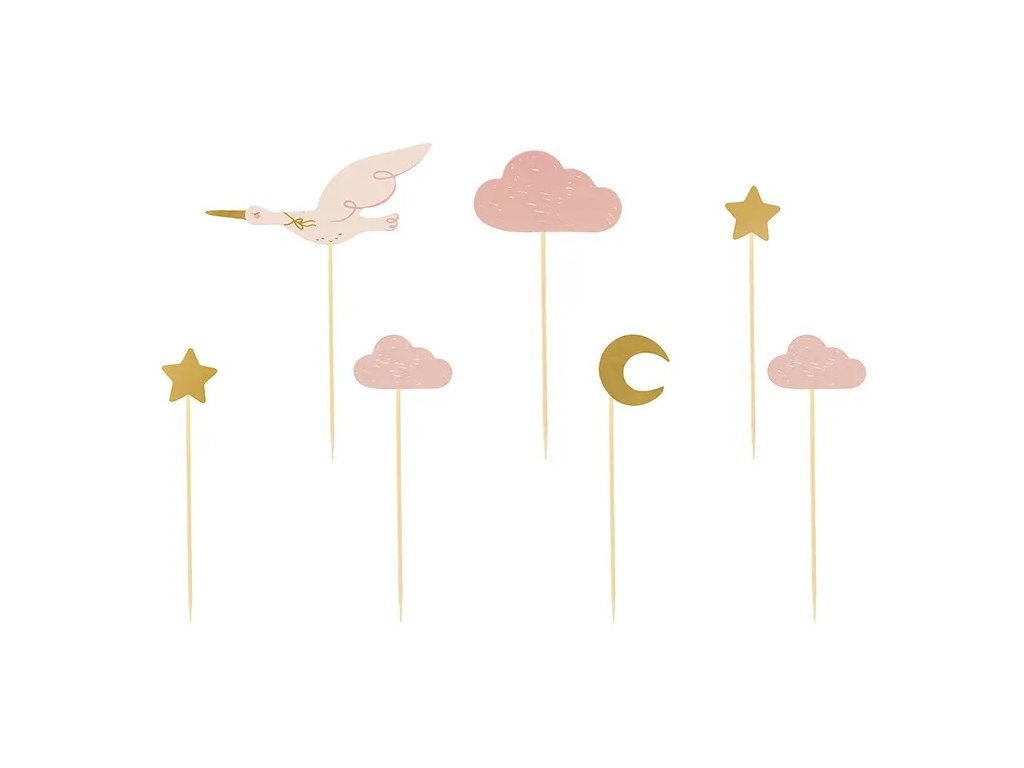 Roztomilé ozdoby na cupcakes a muffiny, které z nich udělají krásná umělecká díla, která je škoda jíst! Čáp, mraky, měsíc a hvězdy. Barva: růžová + zlatá. Množství: 7. Výška: 11-12 cm.