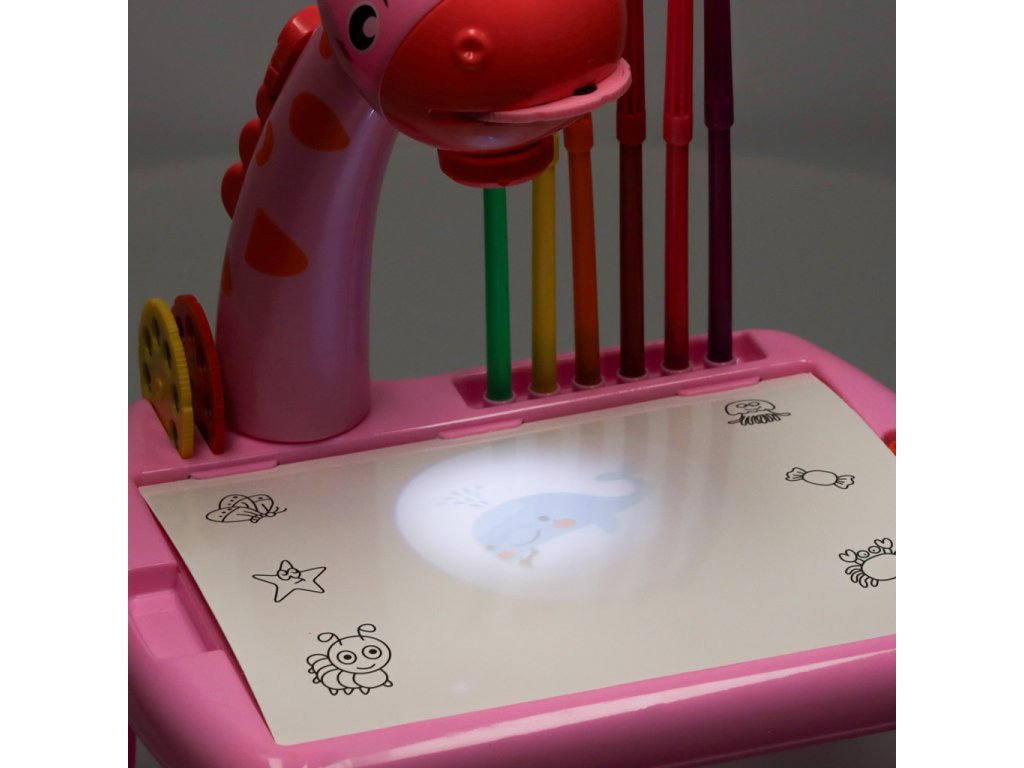 Když stisknete spínač umístěný na krku žirafy, projektor se rozsvítí a odhalí vybraný obrázek z disku. A nyní můžete začít malovat!