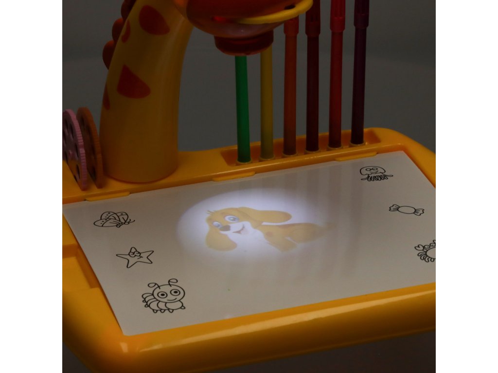 Když stisknete spínač umístěný na krku žirafy, projektor se rozsvítí a odhalí vybraný obrázek z disku. A nyní můžete začít malovat!