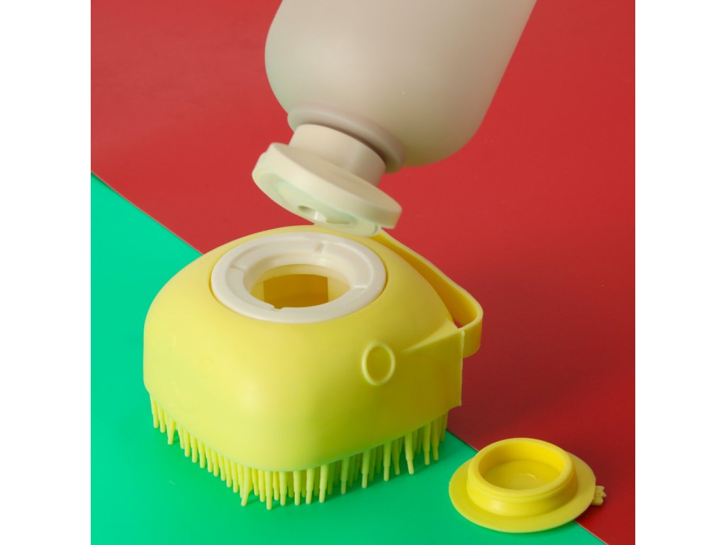 Silikonový kartáč s dávkovačem šamponu na mytí domácích zvířat.