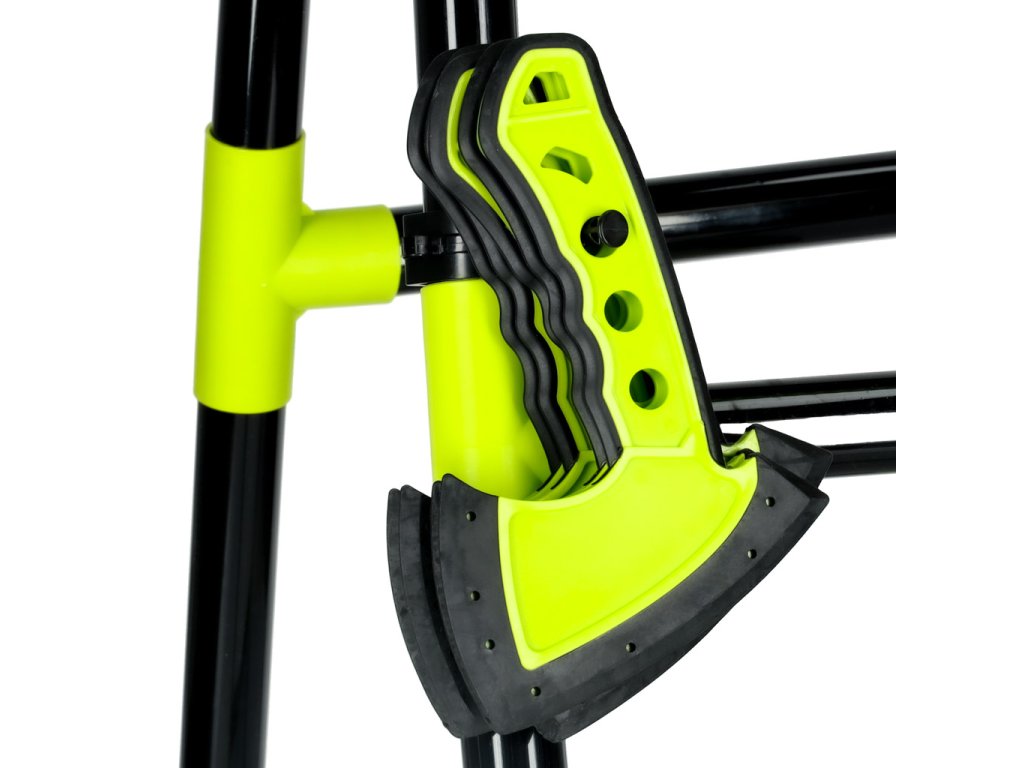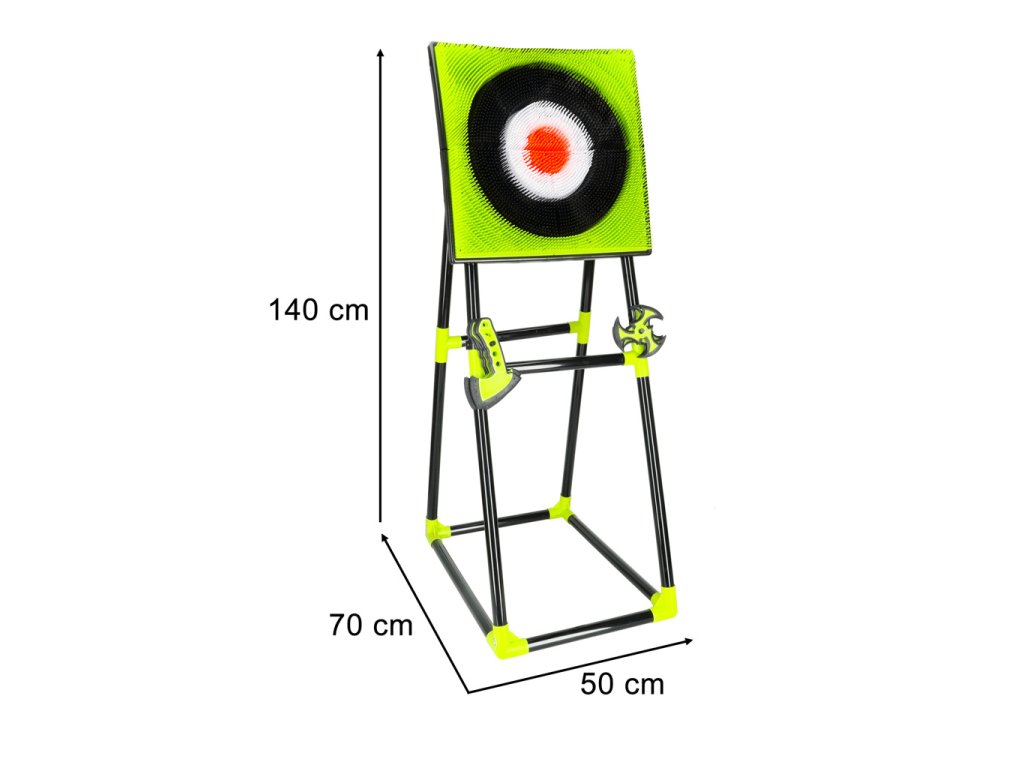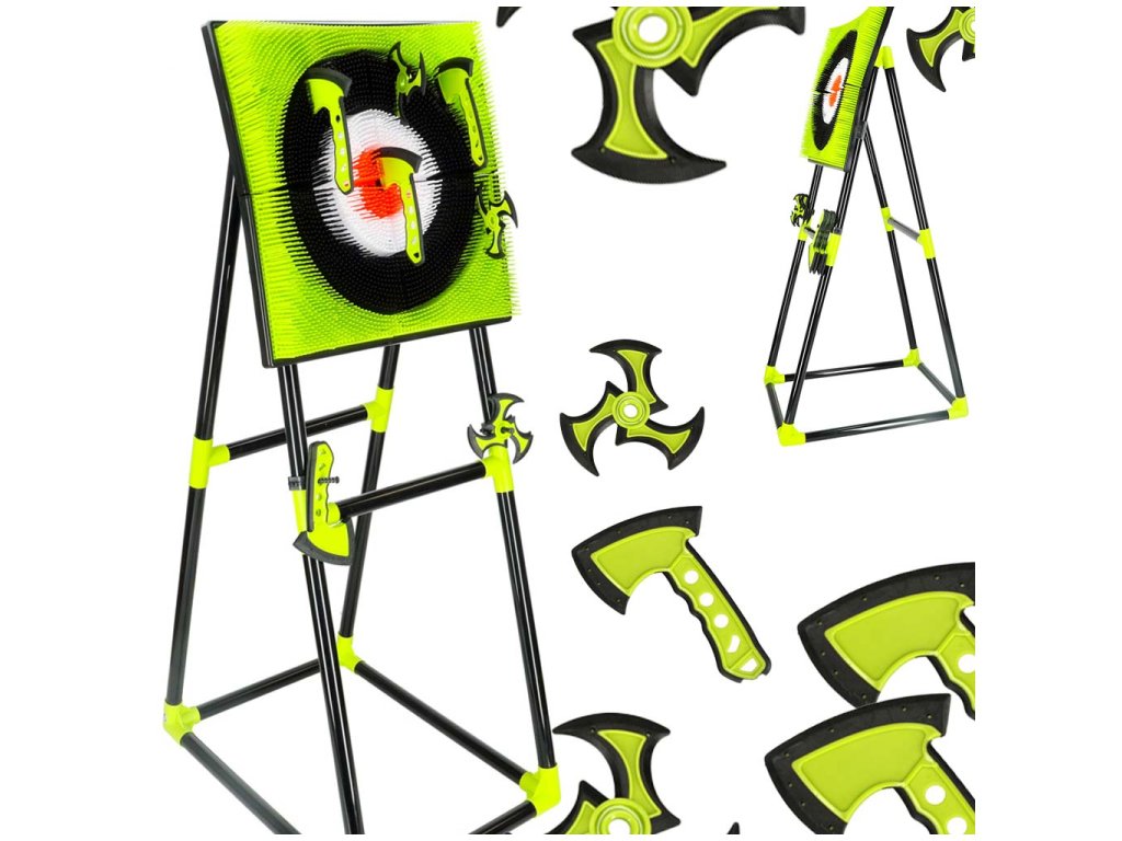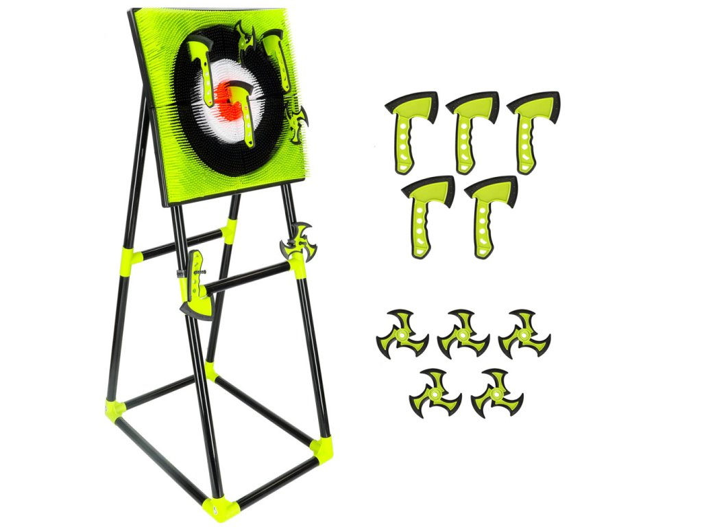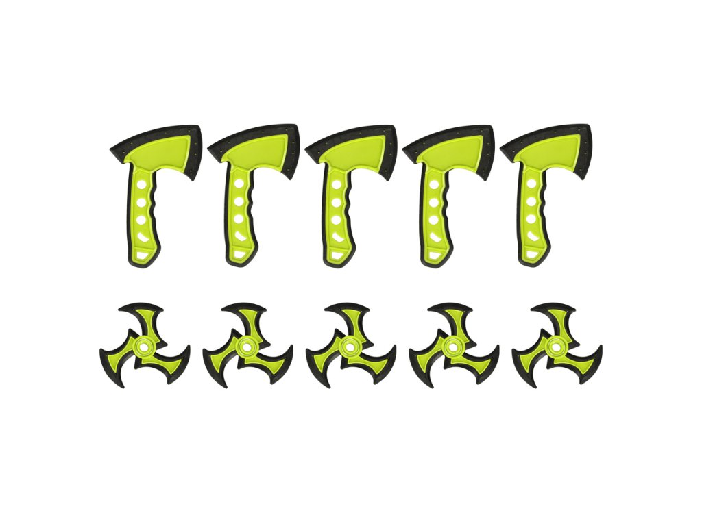 Plastové sekery a šurikeny jsou potaženy měkkým silikonem, takže jejich házení je zcela bezpečné. Každý doplněk je pečlivě vyroben pro autentický vzhled a vzrušující zábavu. Robustní plastový stojan s držadly umožňuje snadné uložení příslušenství a rychlou přípravu sady na další trénink. Vaše dítě se tak může kdykoli zdokonalovat ve svých dovednostech.