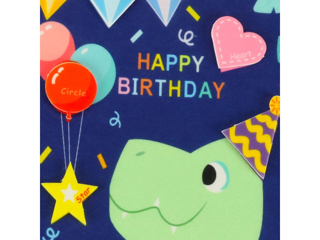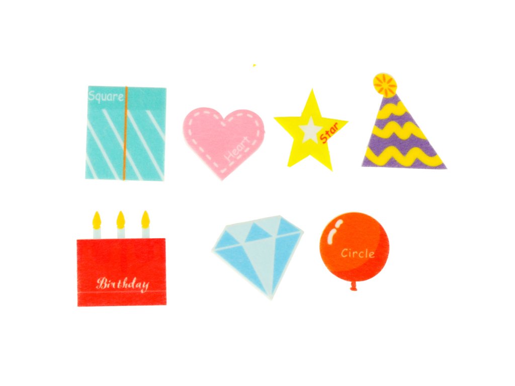 Samolepky: srdce, balónky, hvězda, dort, dárek, kuželovitá narozeninová čepice, dinosaurus