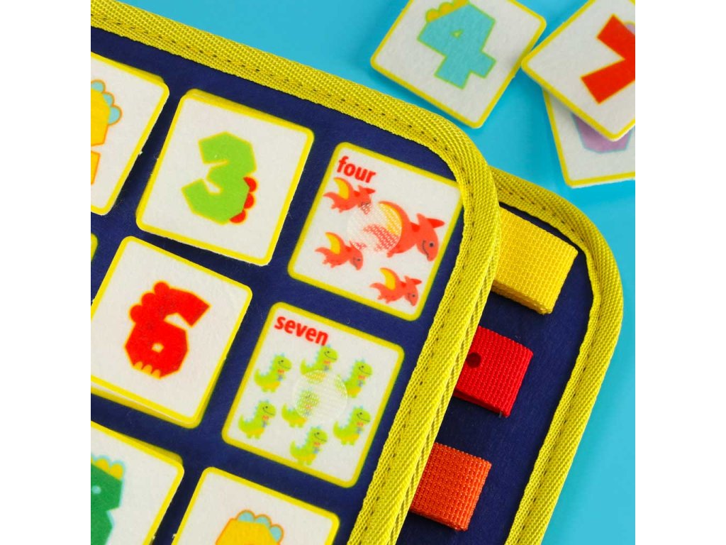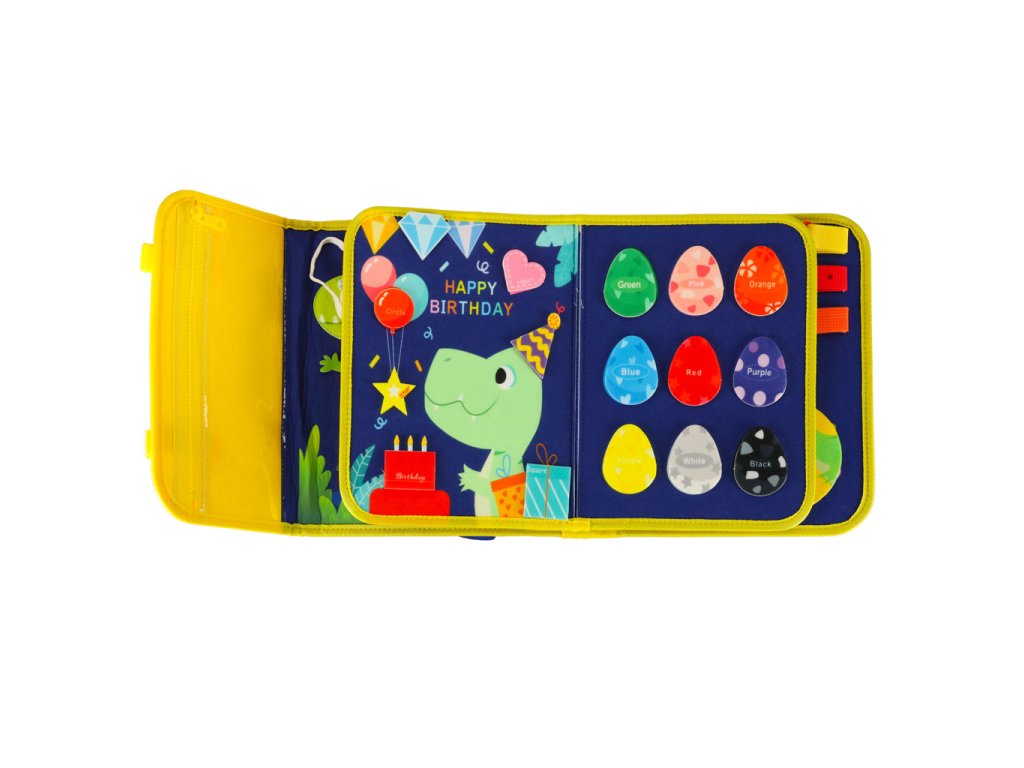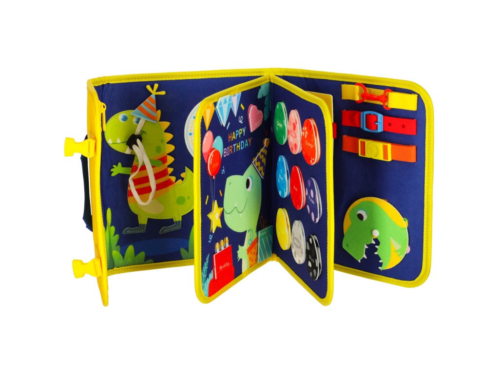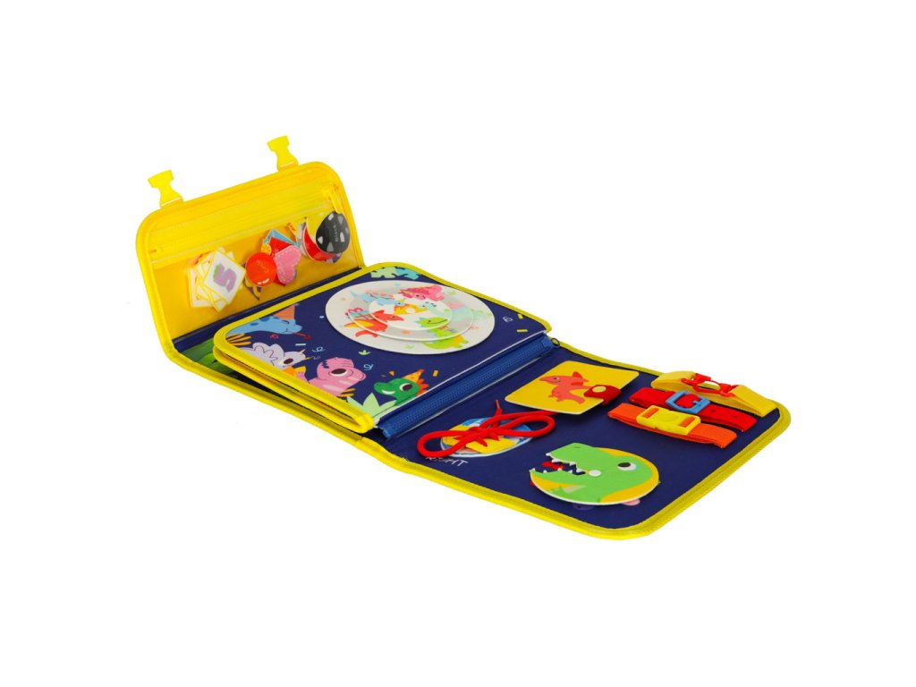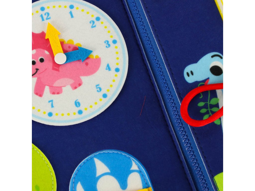 Smyslová manipulační tabule s motivem dinosaurů má prvky, které jsou užitečné při učení jazyka, tvarů, barev a čísel. Některé prvky na tabuli jsou napsány v angličtině, což umožňuje dítěti osvojit si a upevnit slovní zásobu.
