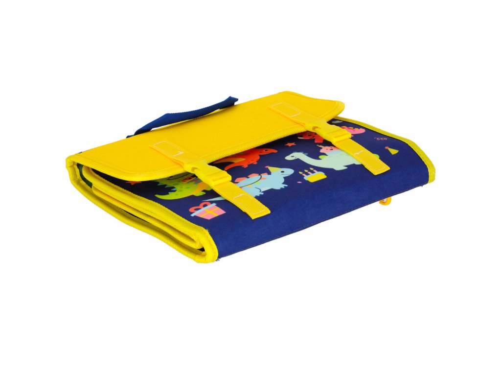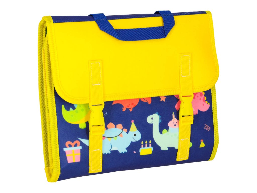 Barevná plstěná tabule s dinosaury vypadá jako klasická školní taška. Ergonomický tvar a výztuhy umožňují její pohodlné přenášení do školy nebo školky. Používání tabule umožňuje pohodlné osvojování a upevňování znalostí metodou učení hrou.