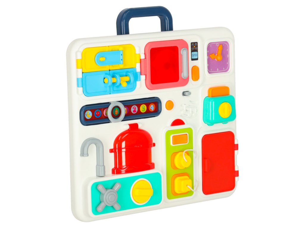 Je to nejen estetická pomůcka, ale především nástroj podporující rozvoj vašeho dítěte. Manipulační deska v kufříku podněcuje představivost, podporuje objevování, učí logickému myšlení a podporujerozvoj motoriky a koordinace. Při hře dítě zapojuje více smyslů - hmat,sluch a zrak - a učení hrou je tak mimořádně efektivní a příjemné. Každý prvekhrací desky byl navržen tak, aby podněcoval zvědavost a povzbuzoval dítě k samostatnému objevování funkcí. Otáčecíknoflíky, otevírací dvířka,realistické zvuky a světelné efekty zajišťují, že manipulační tabule neomrzí ani po mnoha týdnech používání.