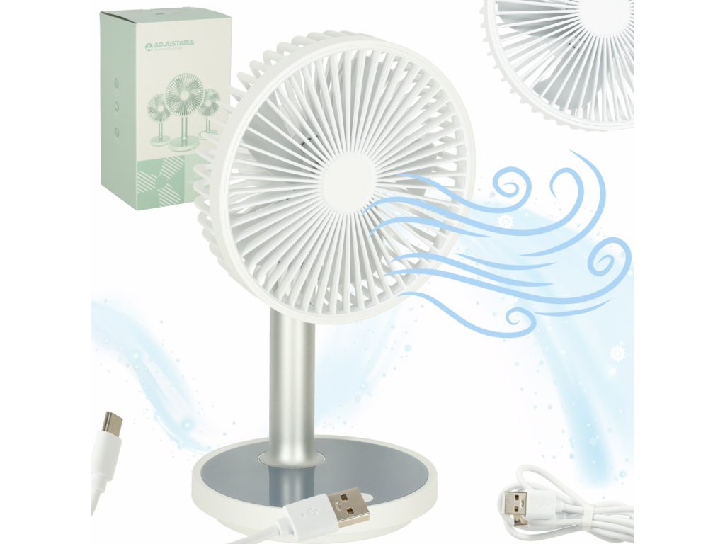 Čtyři provozní režimy umožňují nastavit ventilátor podle vašich představ - můžete si vybrat mezi přirozeným, jemným, středním a silným foukáním. Vestavěná LED světla, která osvětlují stojan, jsou ideální pro použití v noci a poskytují jemné osvětlení. Výšku ventilátoru lze měnit (od 30 do 38 cm), aby lépe vyhovoval vašim vlastním potřebám. Minimalistický design a bílá barva dodávají větrníku nadčasový vzhled. Umístěný na pracovním stole vás bude nejen ochlazovat, ale také ladit s celým interiérem. Díky svým malým rozměrům jej můžete umístit téměř kamkoli - na pracovní stůl, noční stolek, parapet a kamkoli jinam.