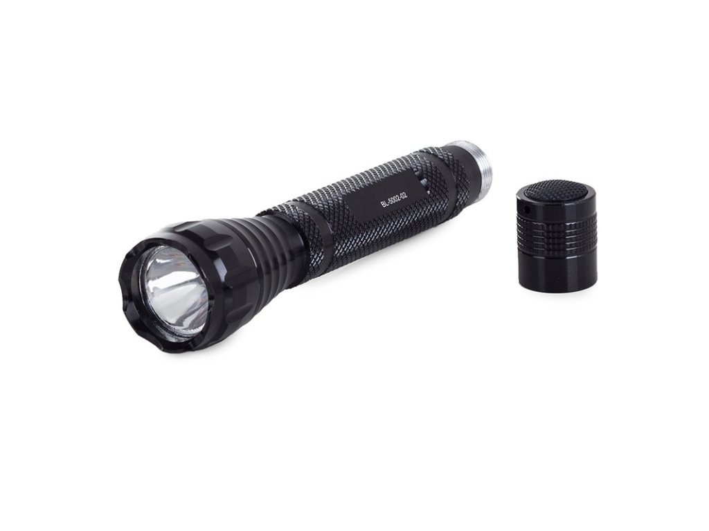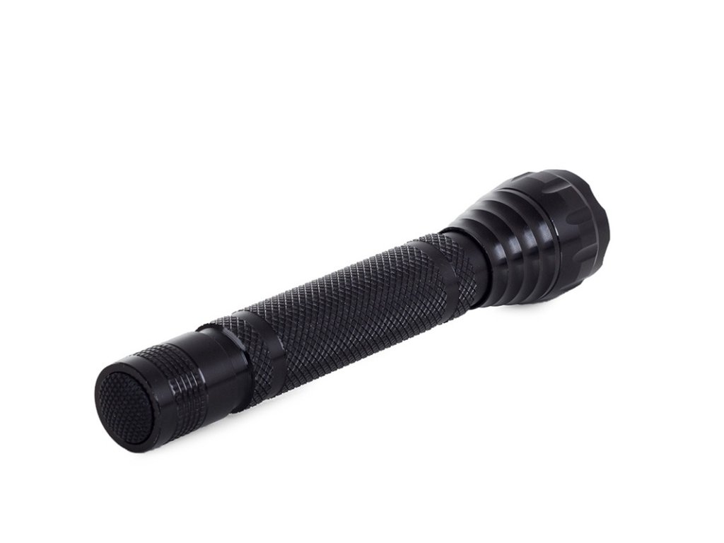 Taktická LED svítilna z hliníku s výdrží až 100 000 h. Odolná, lehká, s pogumovaným spínačem a poutkem na zápěstí. Kompaktní rozměry (15 cm), napájení 2× AA. Ideální pro domácnost i venkovní použití.
