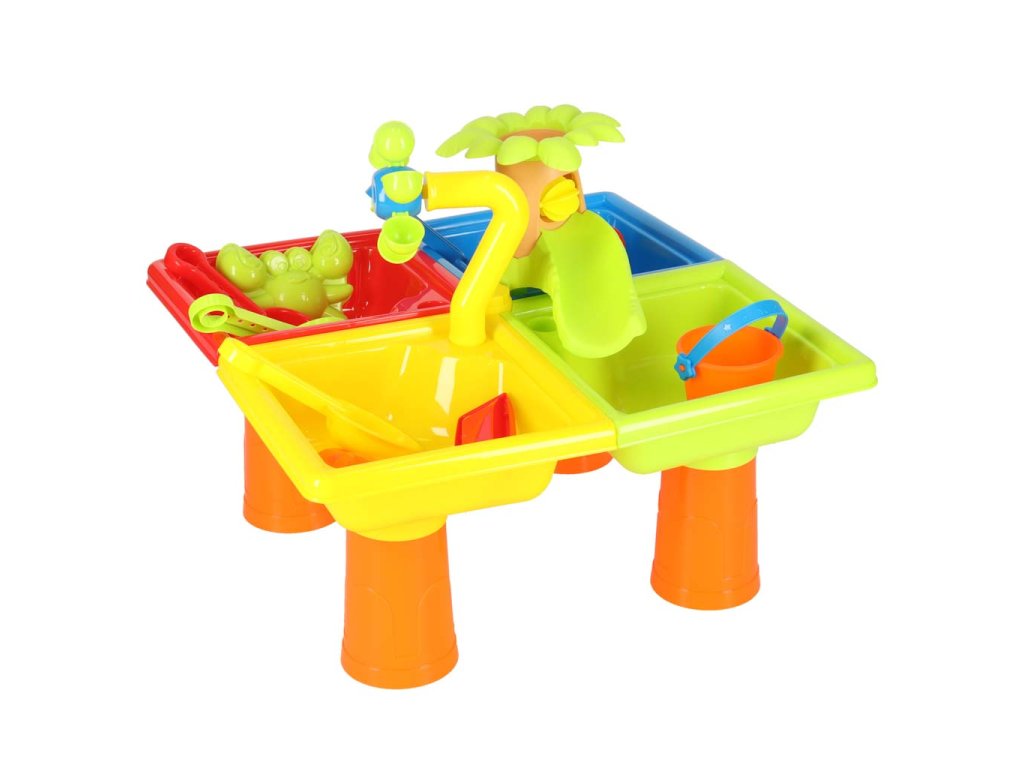 Sada obsahuje stůl s pískovou a vodní částí a rozsáhlý balíček příslušenství. Sada obsahuje příslušenství, které umožňuje hru různými způsoby - od kopání a vylévání až po nalévání a ovládání směru vody.